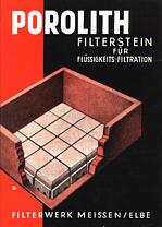 Das Filterwerk zur Zeit seiner Gründung im Stadtteil Meißen-Zaschendorf. - Wichtigstes Produkt um 1960: der keramische Filterwerkstoff POROLITH, hier Prospekte der damaligen Zeit. |