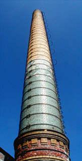 Historischer Schornstein und Wandrelief aus glasierten Klinkern auf dem Firmengelände |